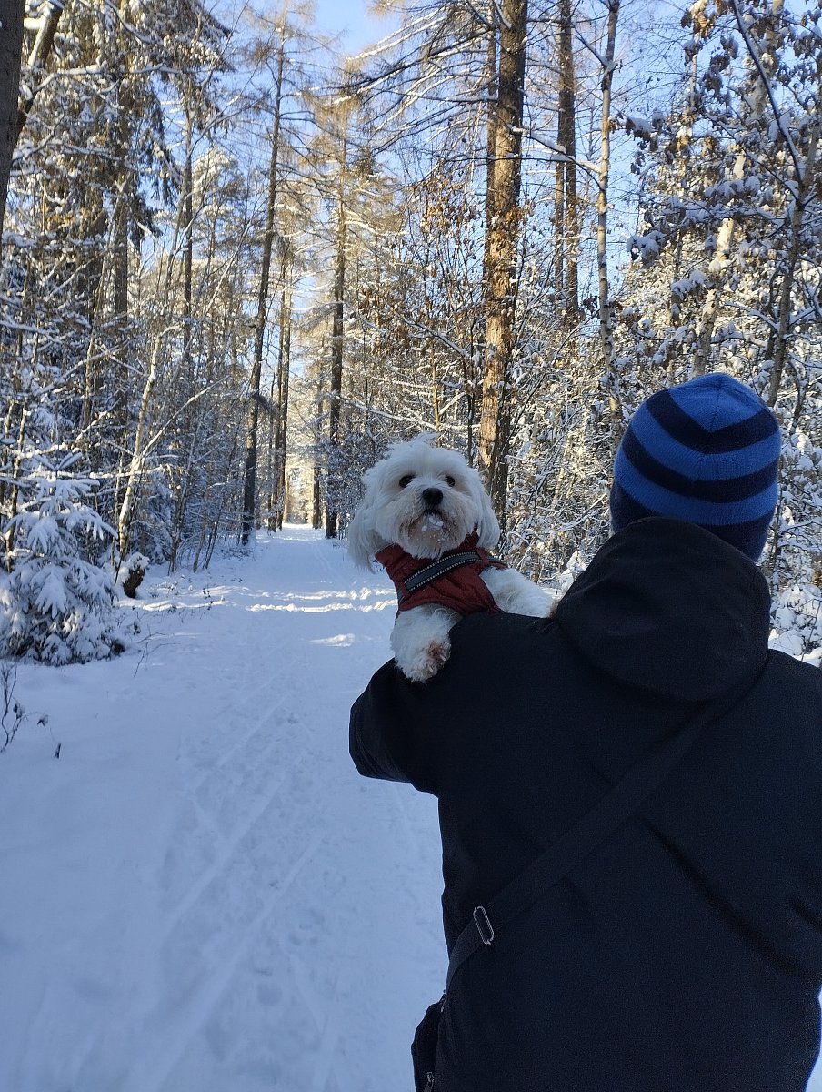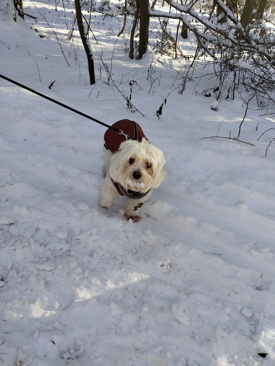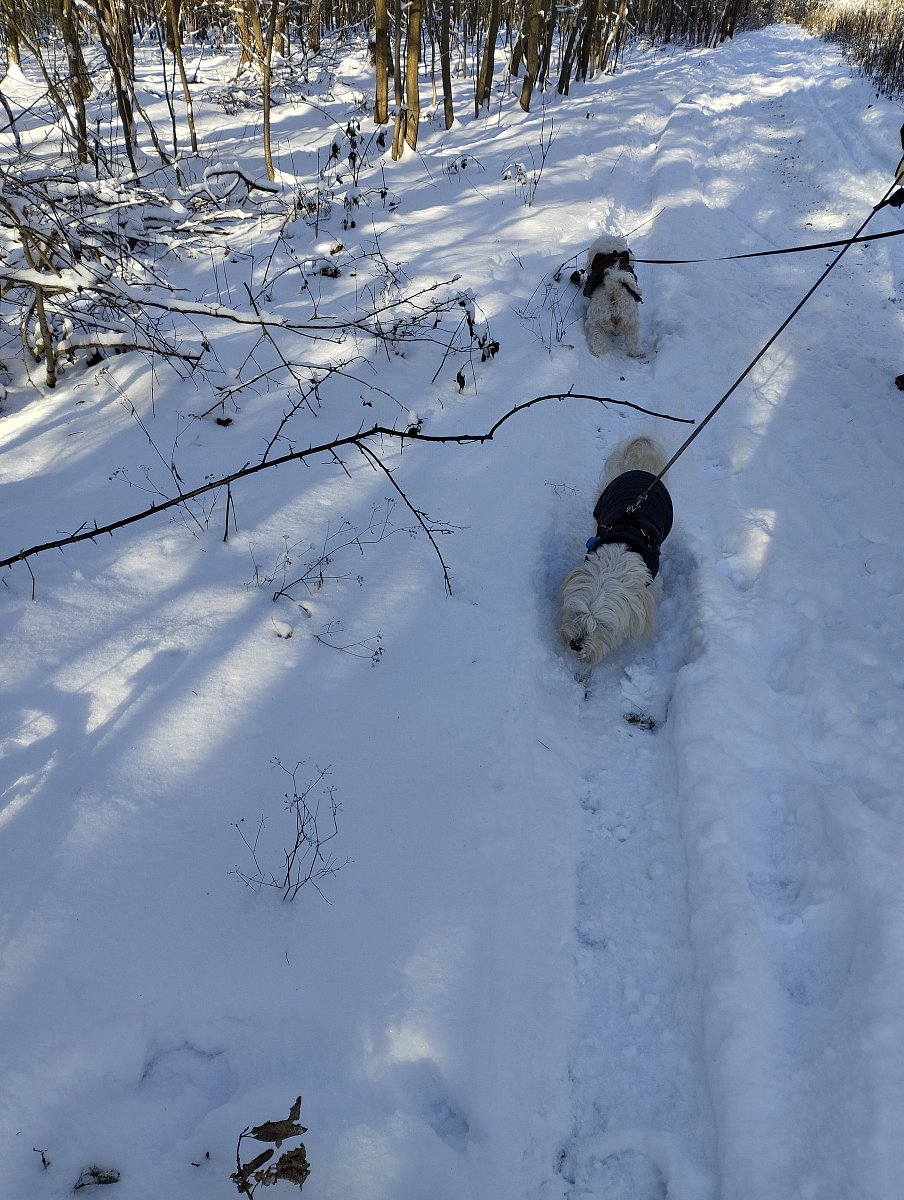 Když jsme byli z lesa venku, museli jsme dávat pozor, abychom nešli po nasoleném chodníku a pro jistotu nám Valdova panička pěkně vymyla tlapky ve vaně a mě ještě trochu vyfénovala. Kabátky nám pověsila, aby oschly a pak nám dala psí dobroty, že jsme to v tom lese zvládli. On to byl prý v lednu nejstudenější den.